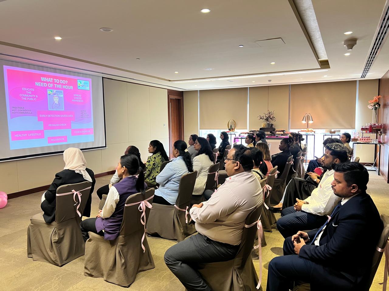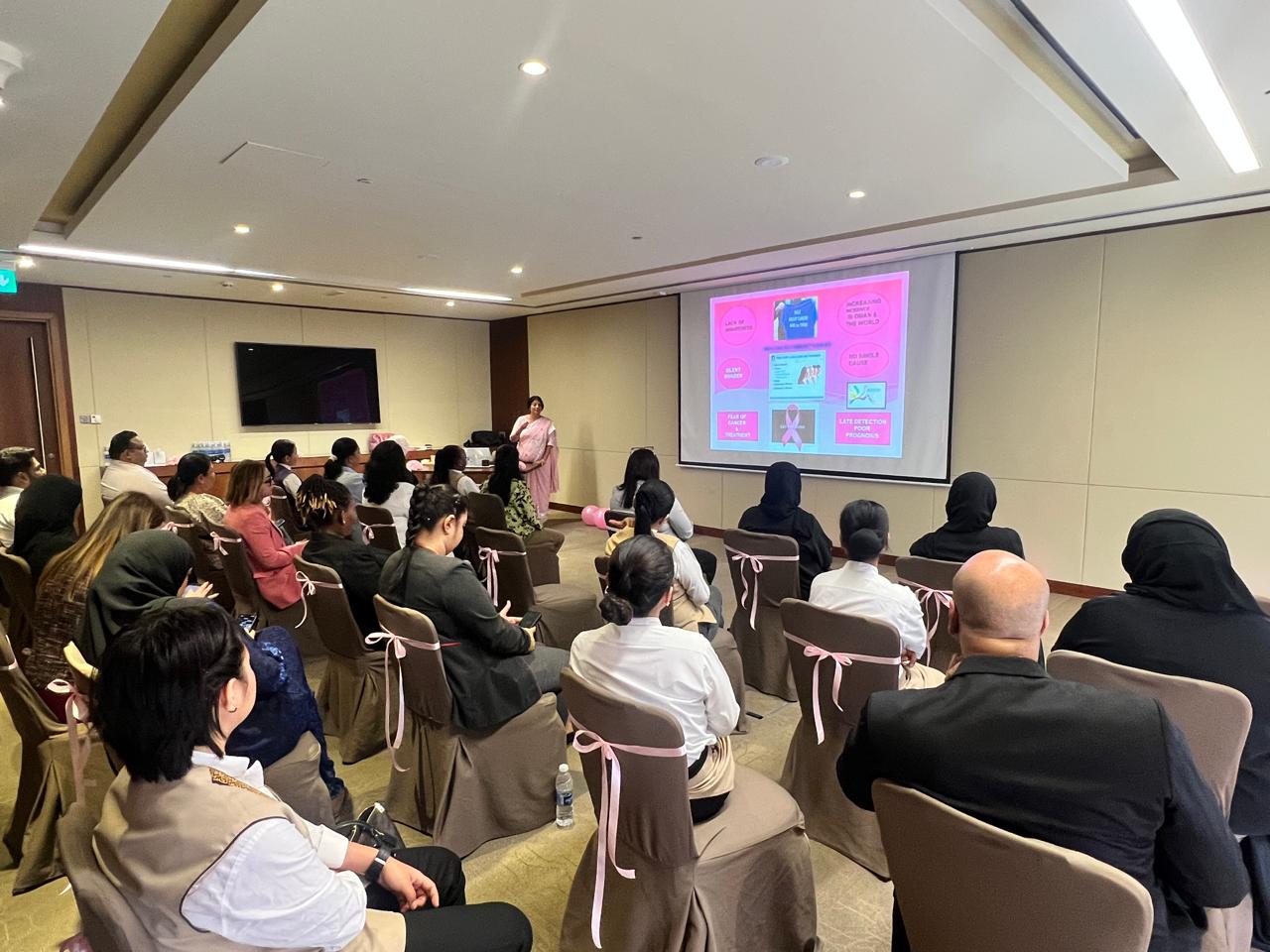 The Awareness Session, was held in the Ruby Meeting Room at Grand Millennium Muscat led by Dr. Rajyashree from the Oman Cancer Association. A total of 32 attendees, including hotel staff, guests, and community guests participated in the session that aimed to educate participants on early detection methods, the importance of regular screenings and most importantly breast self-examination.